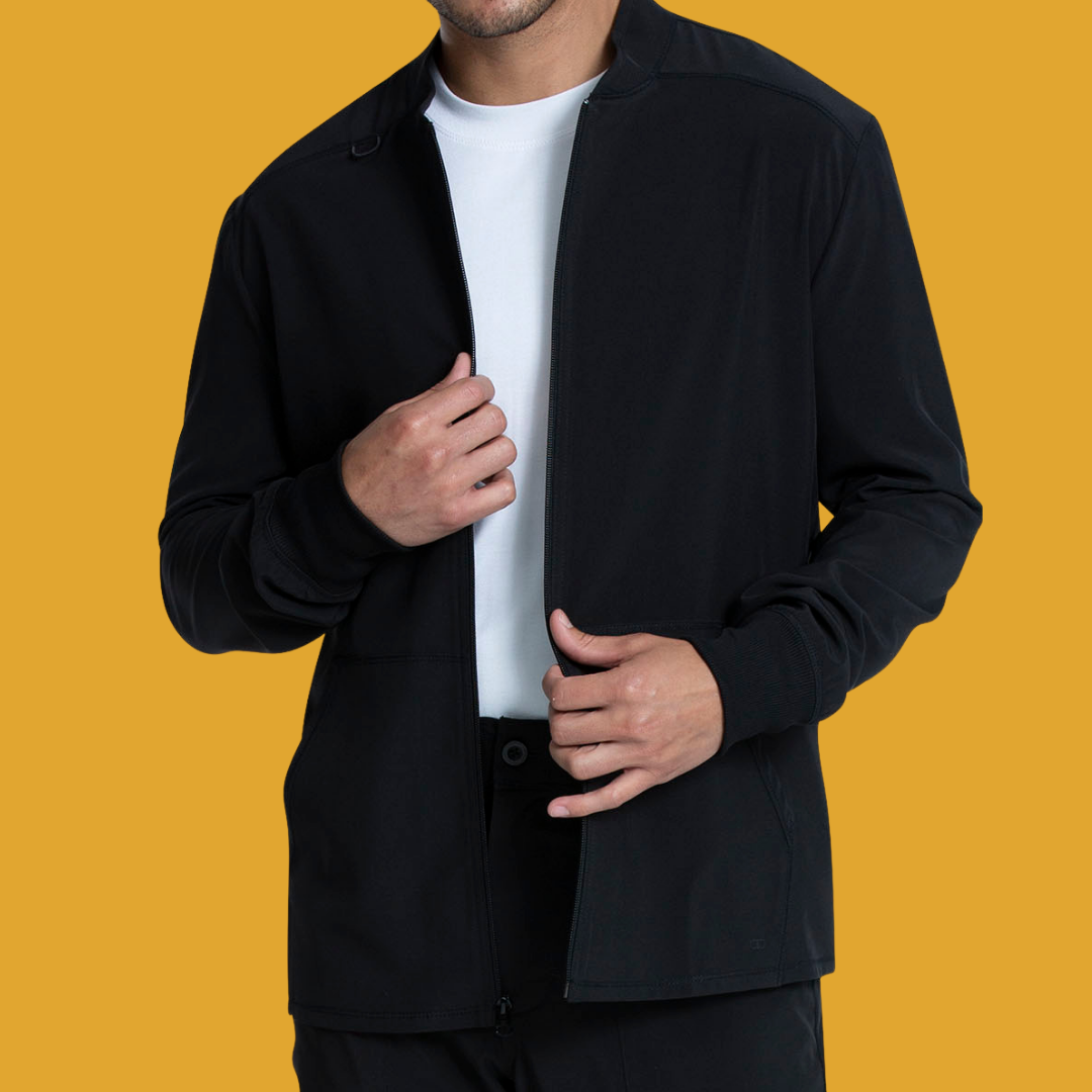 - This Men's Essential Classic fit zip front jacket has a stand-up collar, front and back yoke seams plus a bungee ID badge loop at the front right yoke. Other features include two front patch pockets and provides lots of stretch and moisture wicking. A soft, four-way stretch poplin blend delivers a comfortable, fitted and professional look that respects any size, shape and personal style.